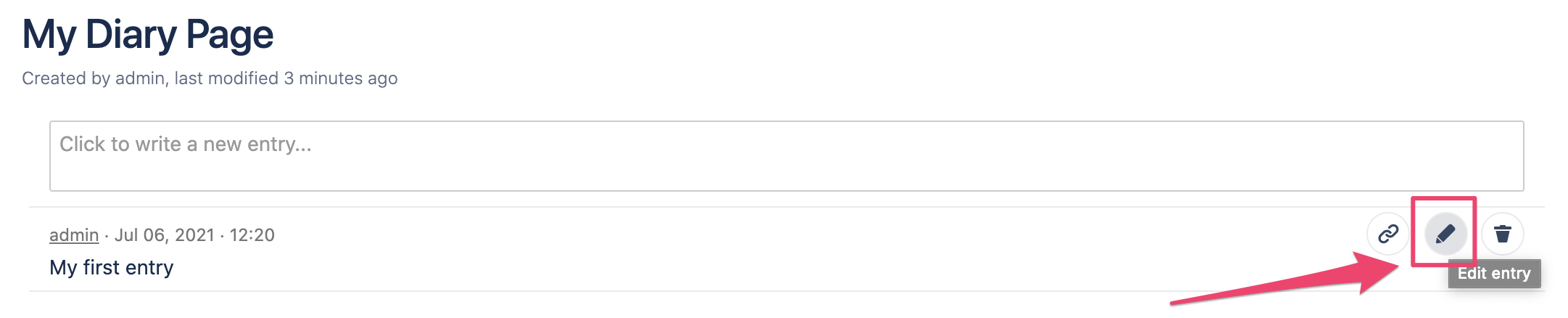The Diary has a feature which allows you to easily edit the content of your entries while viewing the page. Simply hover over the entry you want to edit and click on the pencil icon.