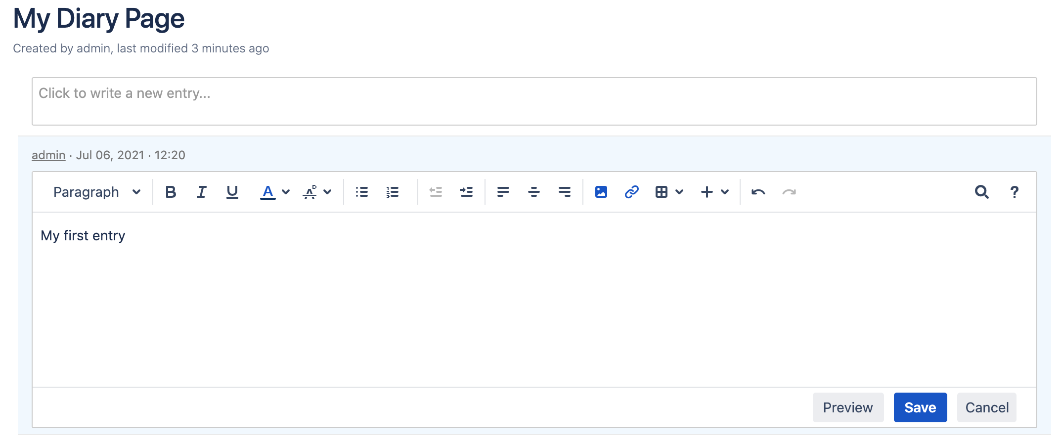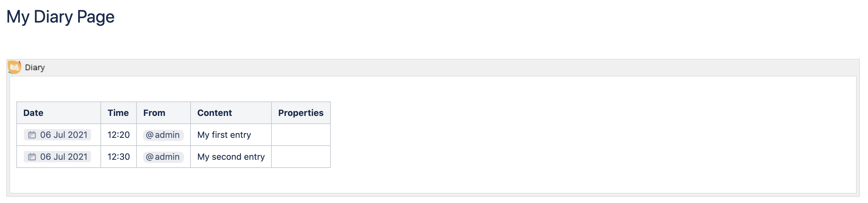 Beware! Should you break an entry (for example by deleting its author or setting its time to something invalid like “24:53”) the entry will not be rendered by the Diary macro anymore. This can easily be fixed by reverting the page to a previous version or manually repairing the broken values via the page editor.