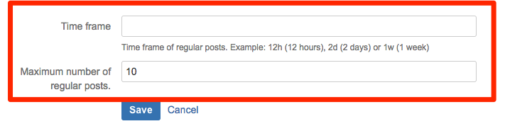 The maximum number of displayed posts and the time frame on the dashboard can be configured with the parameters "Maximum number of regular posts" and "Time frame" in the dashboard section.