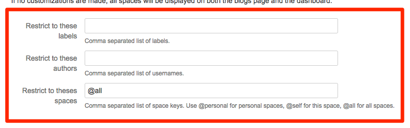 Blog posts on the dashboard can be filtered by labels, authors and spaces under the section "Featured posts". If one of these filters is used, a new category "Featured Posts" will be added to the blogs overview page.