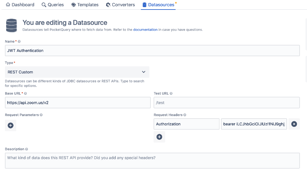 Now you can create a new data source. Select a suitable Name, set Type to “Rest Custom”, Base URL is “https://api.zoom.us/v2” and create a new Request Header, name “Authorization” and value: