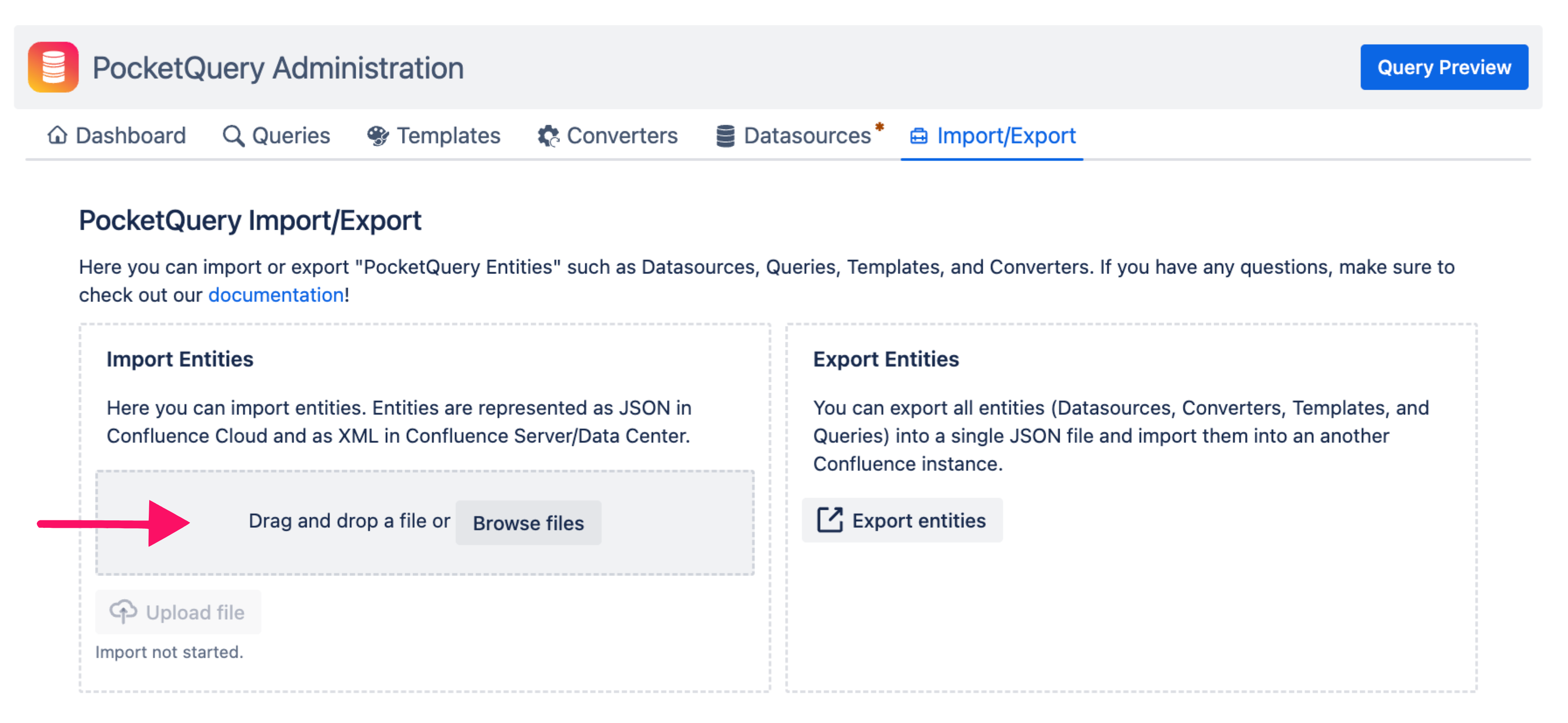 There are two types of PocketQuery Imports: JSON and XML. The format of the file depends on the Confluence that generated the file. If you are migrating from Confluence Server/DC, you will have an XML file. If you use an export file from Confluence Cloud, you will have a JSON file. During the import process, you should not note any differences between these file formats.