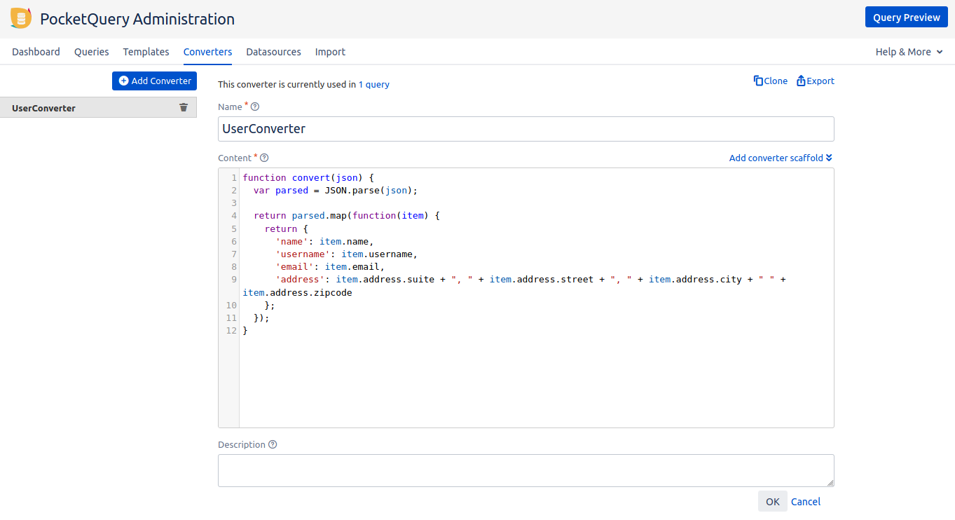 Click the “Converters“ tab in the PocketQuery Administration and click “Add Converter“. Give it an appropriate name. You can use the text button "Add converter scaffold" to help you get started.