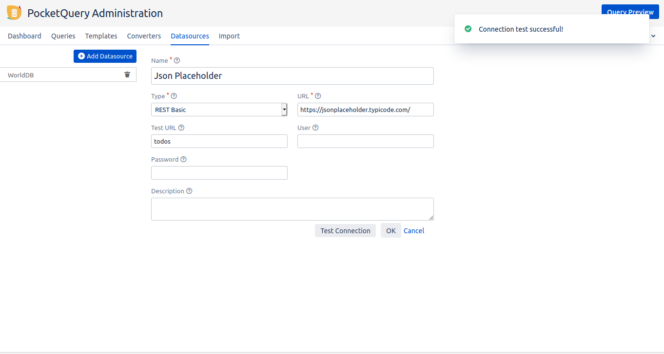 Go to the datasources in the PocketQuery administration and add a new one with the type "REST Basic". Give it a reasonable name and set the parameters: