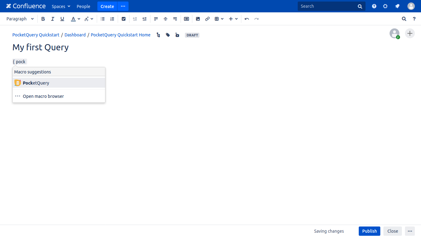 Go to any Confluence page in any space you like and edit it. Add the PocketQuery Macro to it, either by clicking the plus icon from the toolbar and selecting "Other macros" or by typing an opening curly bracket followed by "pocketquery".
