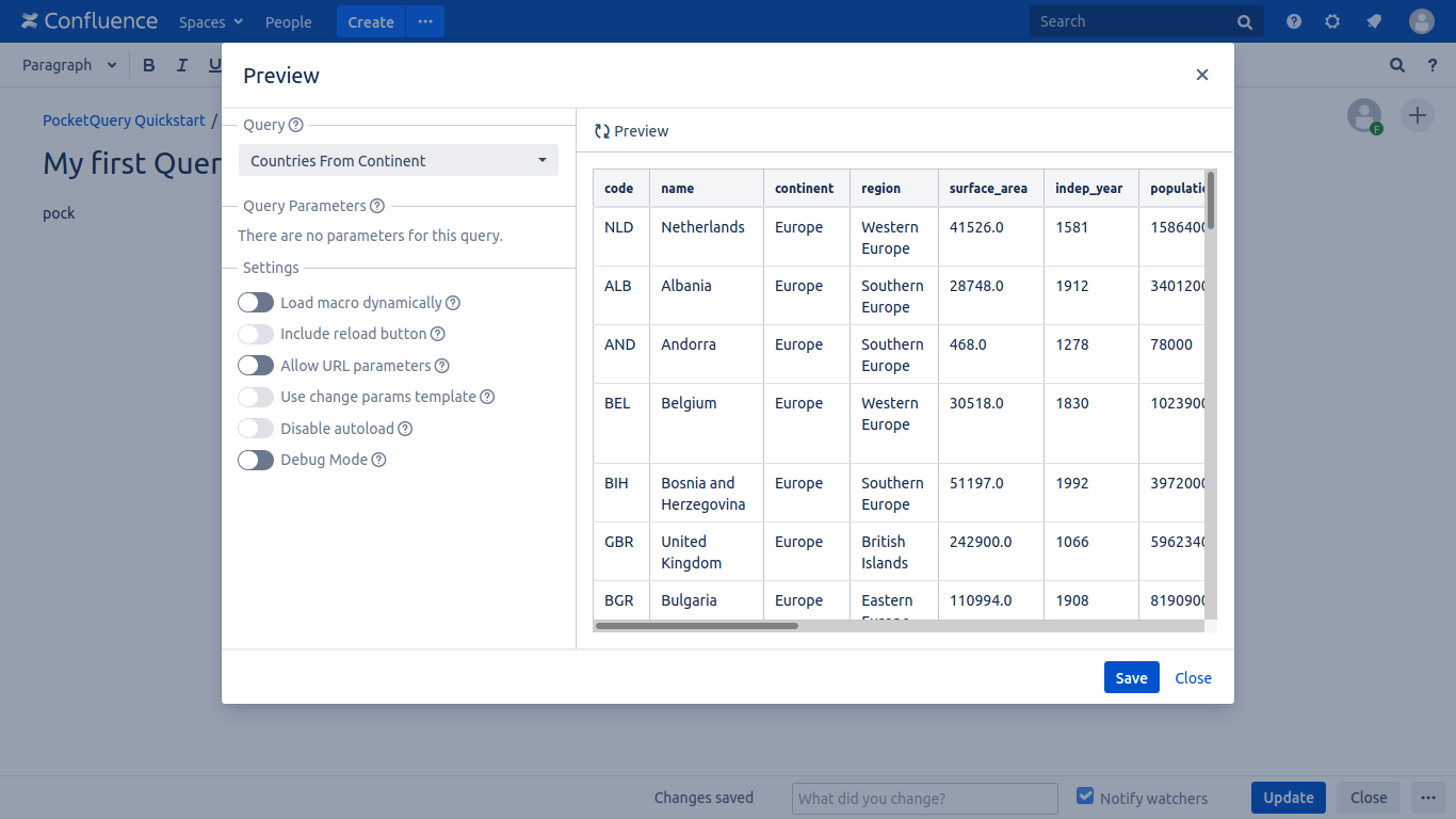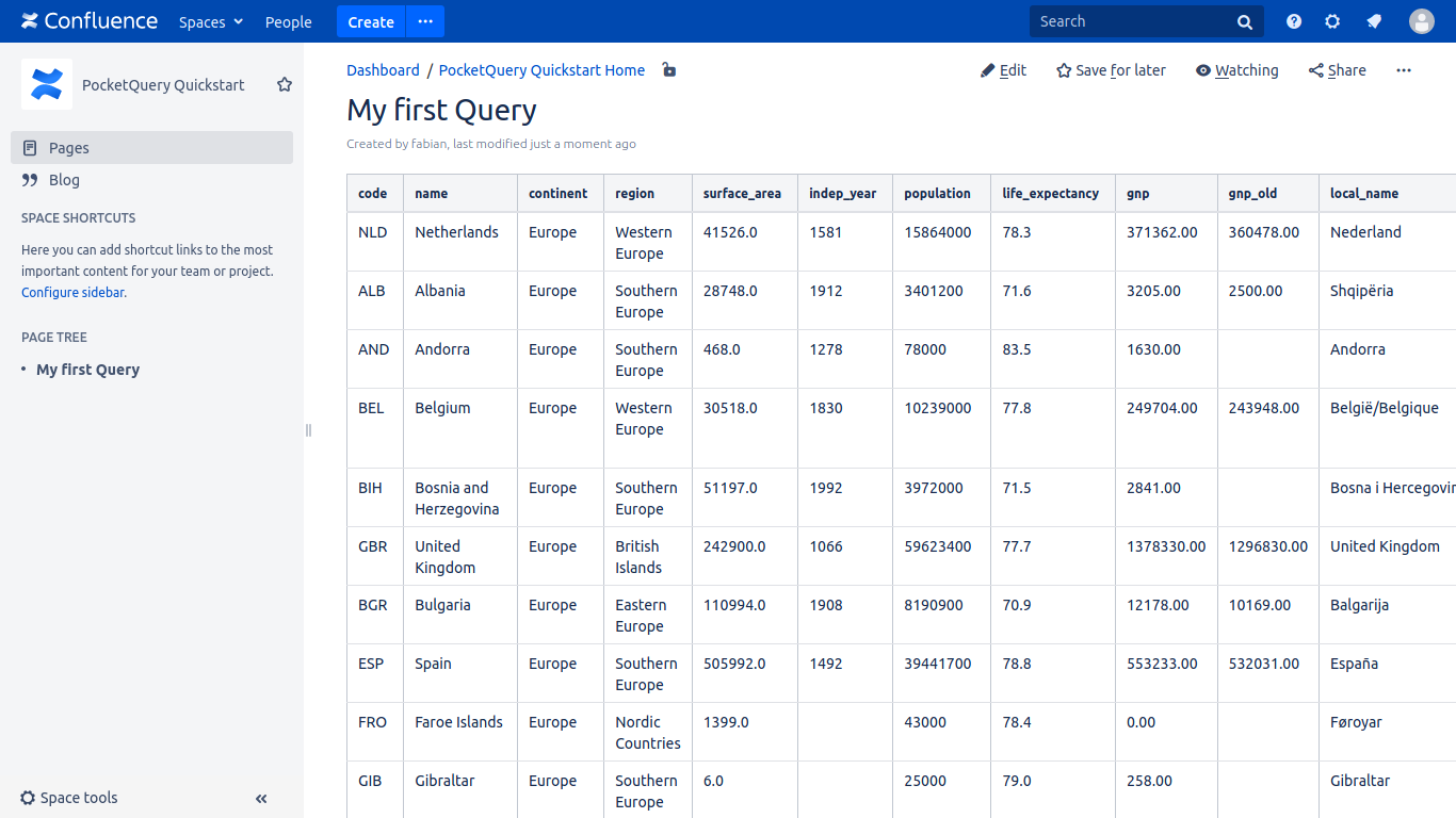 Save the Confluence page and have a look at the big table the PocketQueryMacro displays. This data comes straight from the "world" database!