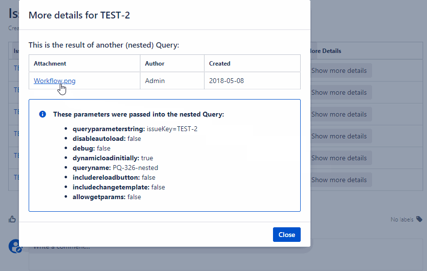 To this function we pass the $nestedQuery, the container that the Query should be rendered into, and of course the issueKey for the selected issue.