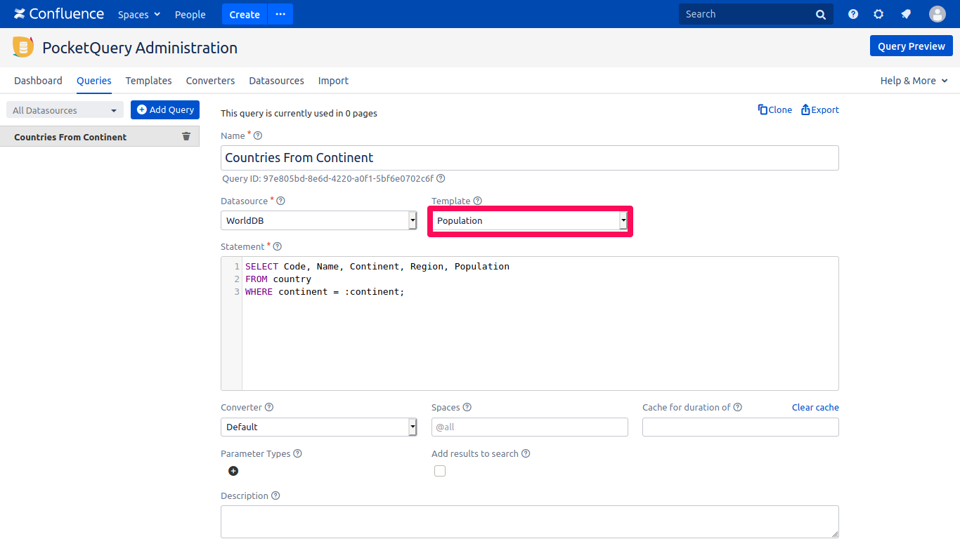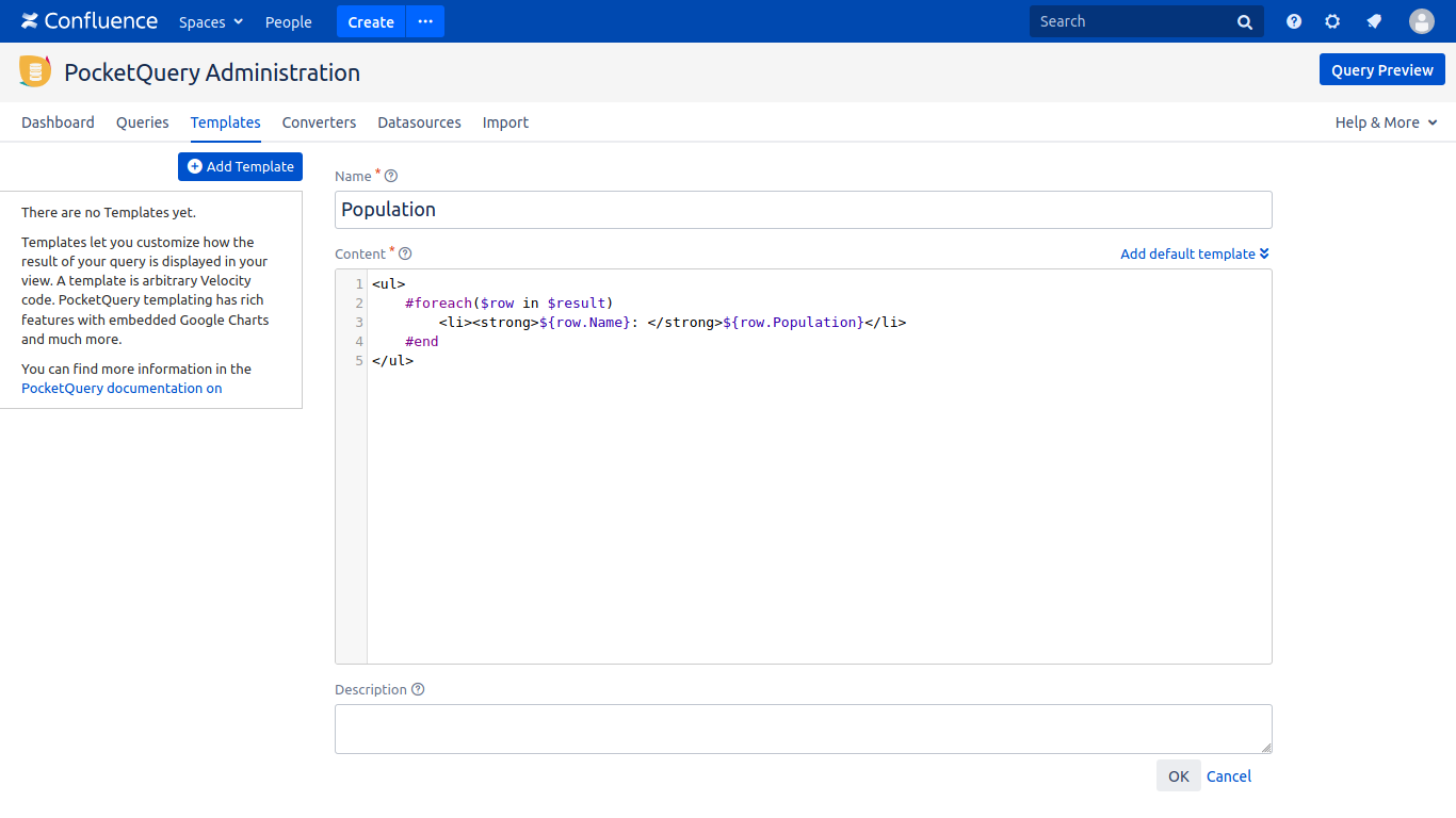 To further customize the output of the macro, you can use a custom template. Templates are built using the powerful templating engine Velocity. Go to the PocketQuery administration, choose the tab "Templates" and click "Add Template".