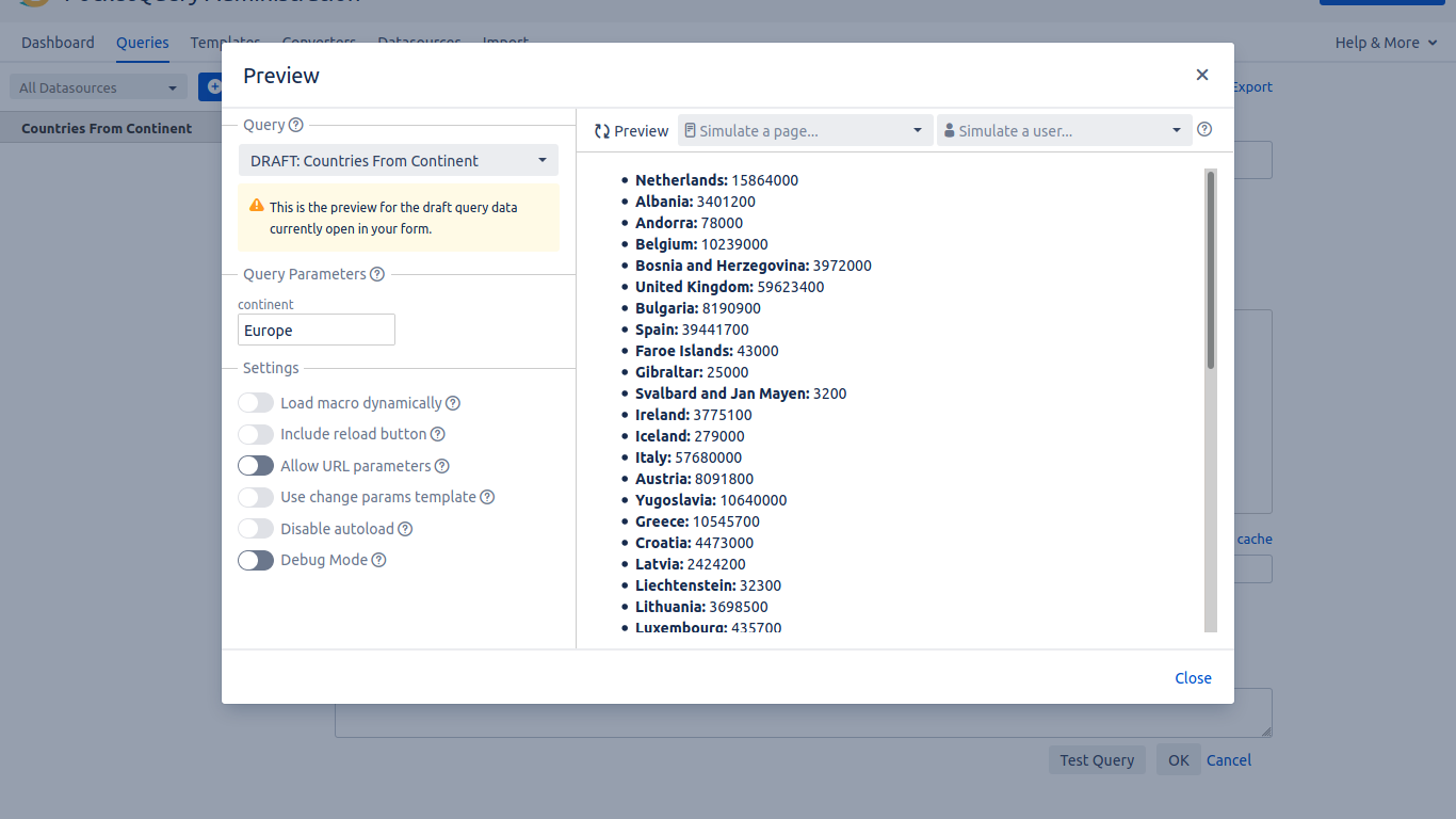 Save the query, and press “Test Query“. After entering “Europe“ into the continent parameter we created earlier, you get a completely different looking result: