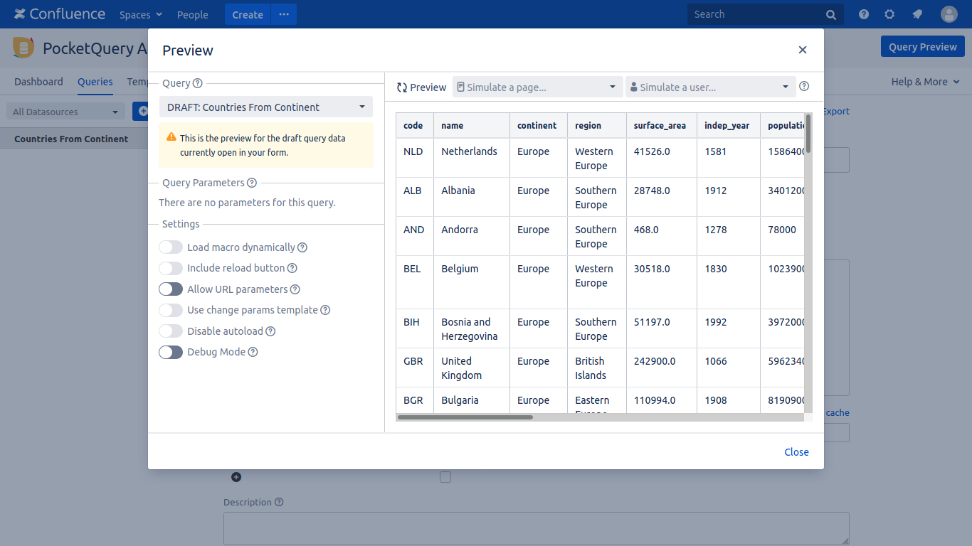 Save the Confluence page and have a look at the big table the PocketQueryMacro displays. This data comes straight from the "world" database!
