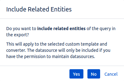 Notice that when you export queries you will be asked whether you want the related entities to be included. Choosing “Yes“ will create an export that contains not only the query, but also the referenced template, converter, and datasource. (For PocketQuery editors the datasource will be omitted.)