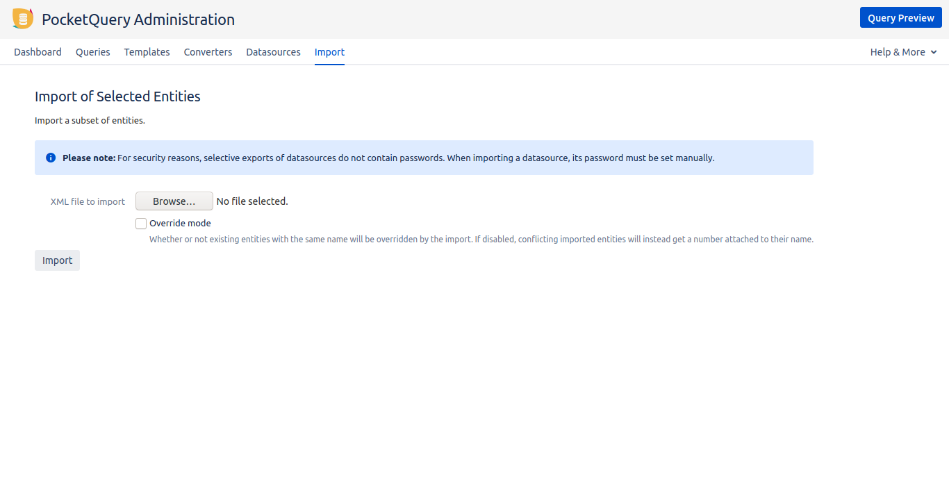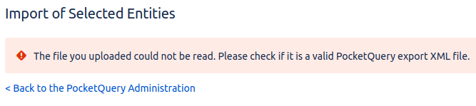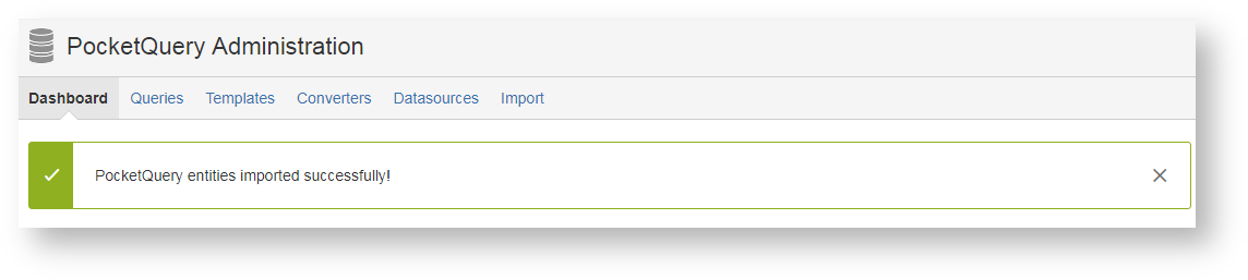 To import your entities, switch to the “Import” tab in the PocketQuery administration. Choose the file you want to import and click the “Import” button.