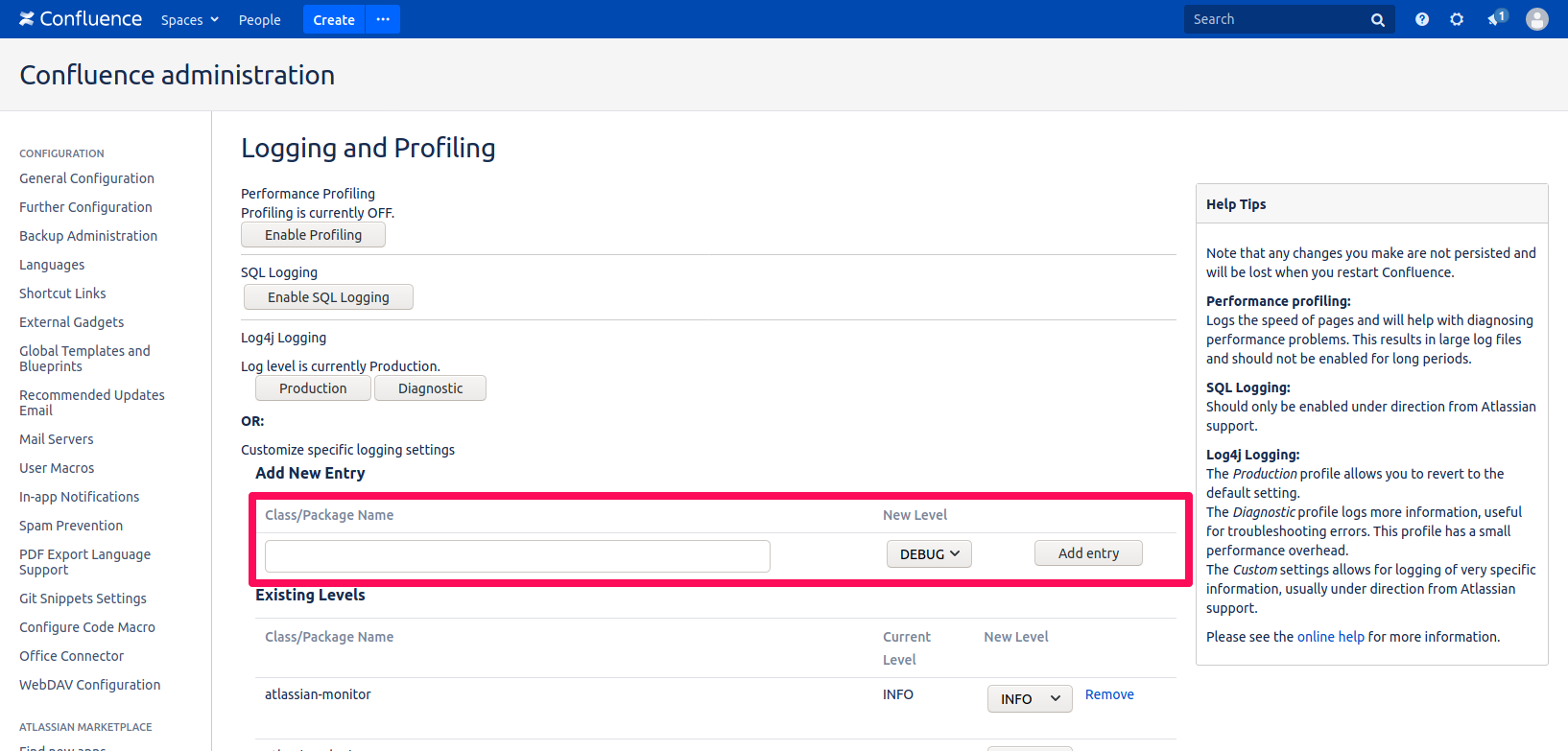 On this page, you can add or modify logging levels for various confluence components.