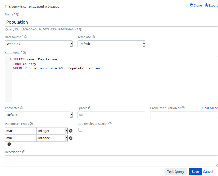 Using this query, you’ll be able to display names and populations of countries. You can specify a population range you’re interested in when adding the PocketQuery macro to a page. Simply set the parameters 'min' and 'max' to your liking.