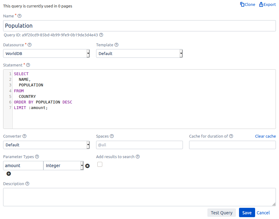As mentioned above, both SQL queries and REST calls may include PocketQuery parameters. These parameters can be set when adding the PocketQuery Macro to a page which makes the query much more versatile.