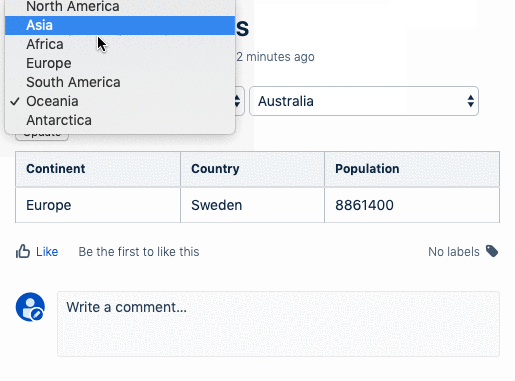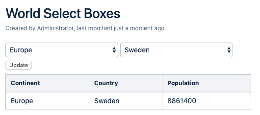 The idea here is this: I select a continent (left select box) and the list of countries (right select box) will update by executing another PocketQuery in the background. Then, when I click on "Update", the main query will be executed with the continent and country in the above select boxes. The result will display the country's continent, country, and population.