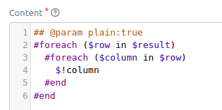 <script>tags) to arrange the data of your result. Note: It might be helpful to start with the default template and then adjust it to your needs step by step. Click the text link on the top right above the content field to get its code inserted.
