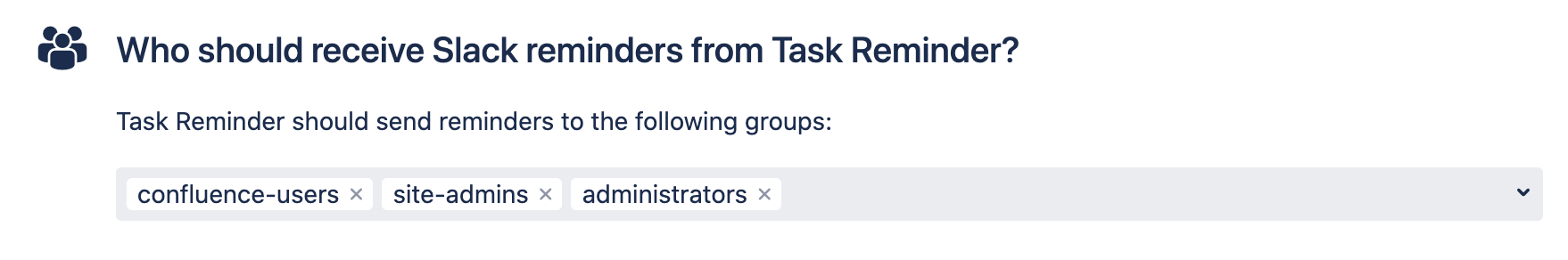 In this section you can select up to 5 groups to receive reminders. Each user in the selected groups will receive a reminder if they have any unresolved tasks. We have found that 5 groups is sufficient for most use cases. If your user set cannot be covered by 5 groups, we recommend creating a group specifically for Task Reminder.