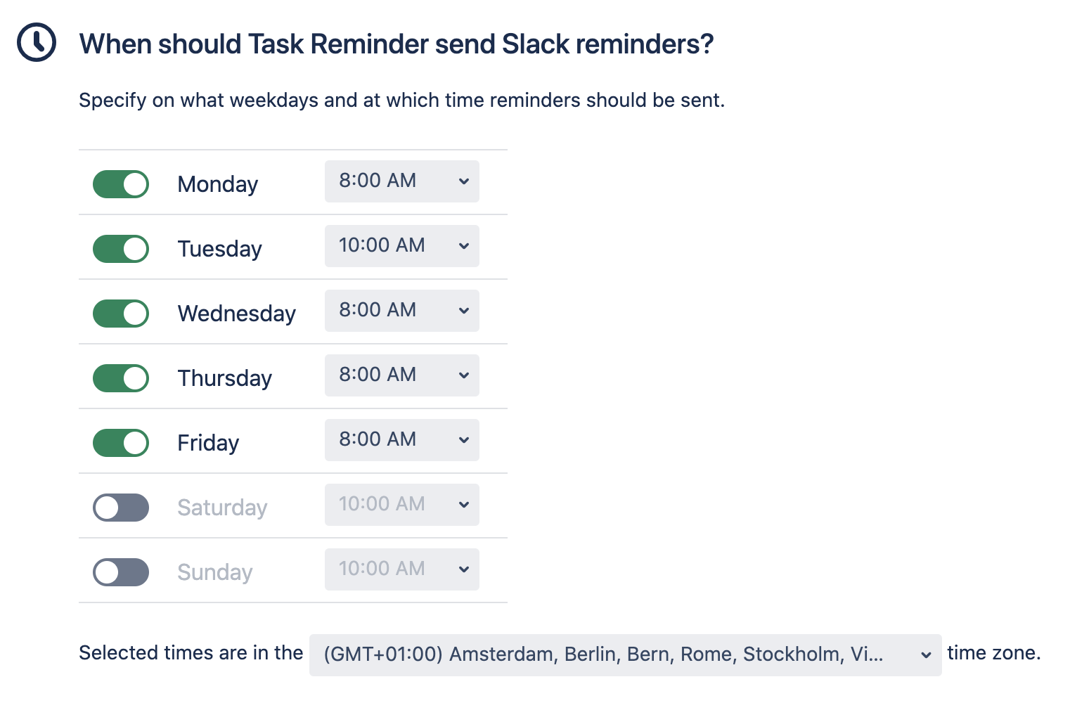 Here you can set the schedule for your reminders. Simply select the days and times that you would like to send reminders. Make sure to also let Task Reminder know the time zone that you’re in.