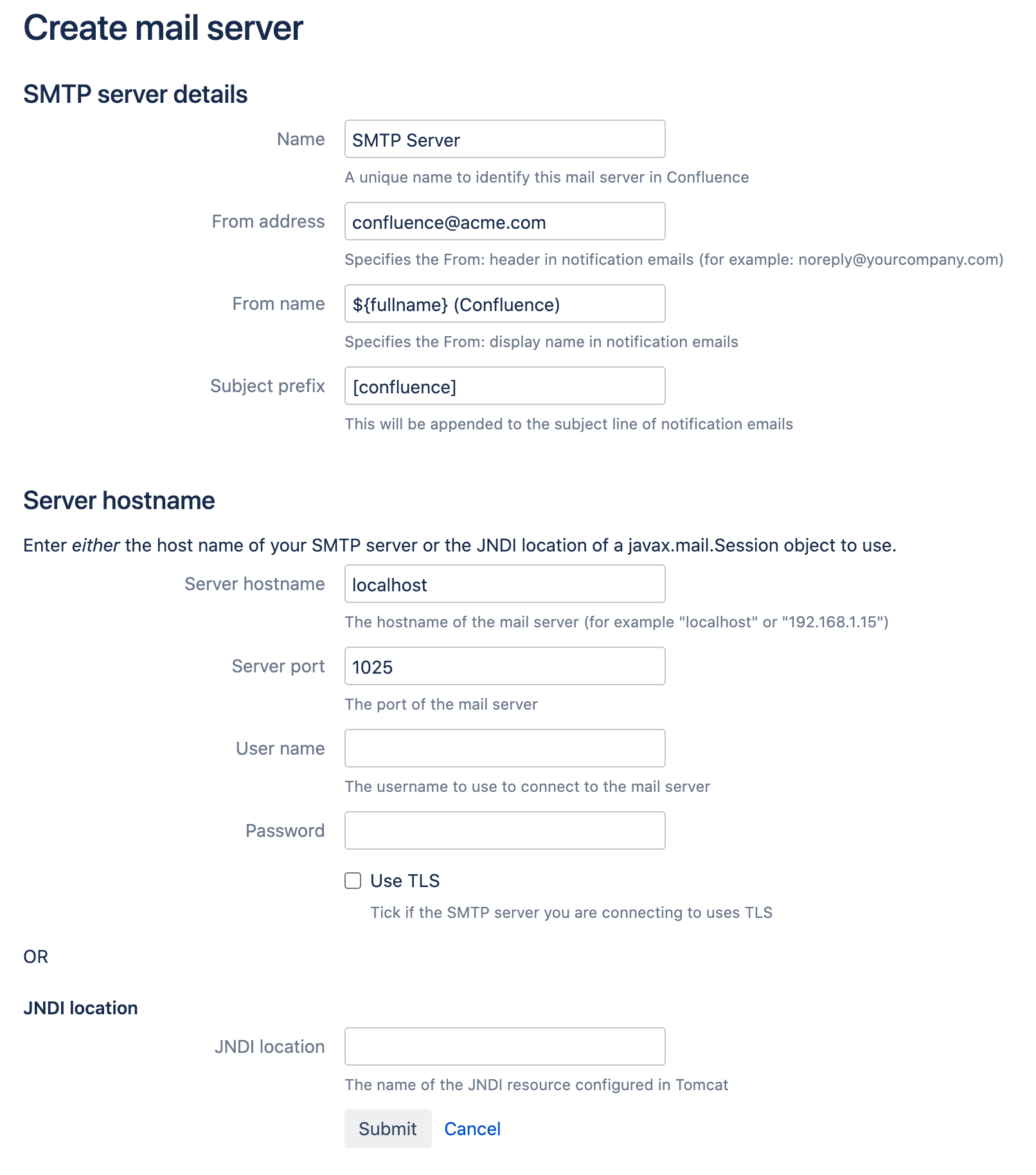 Now you will need to configure Confluence to use mailhog as its SMTP server. So, head over to “General Configuration > Mail Servers” (/admin/mail/viewmailservers.action) and click on “Add a new SMTP mail server“.